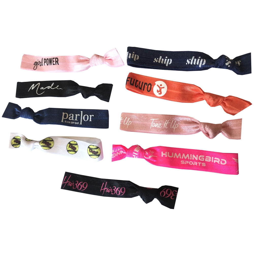 Each Hair Tie is made from a soft and stretchy material that has been hand-dyed, knotted, and heat sealed to prevent fraying on the ties ends. It's gentle on your hair, don't pull and dent your hair like the traditional ponytail holders. Completely Hand Washable. They are not only can be used for hair tie, but also can wear them as bracelets or anklets. Come with various of colors,and custom logo is available. Great for Fashion or Sports.