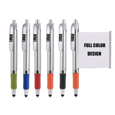The perfect advertising pen features a comfortable rubber grip and a retractable pull-out banner from inside the barrel. This is banner, ballpoint and stylus combination. Create a colorful branded advertisement with your logo, product or contact information with a banner that pulls right out of the barrel.