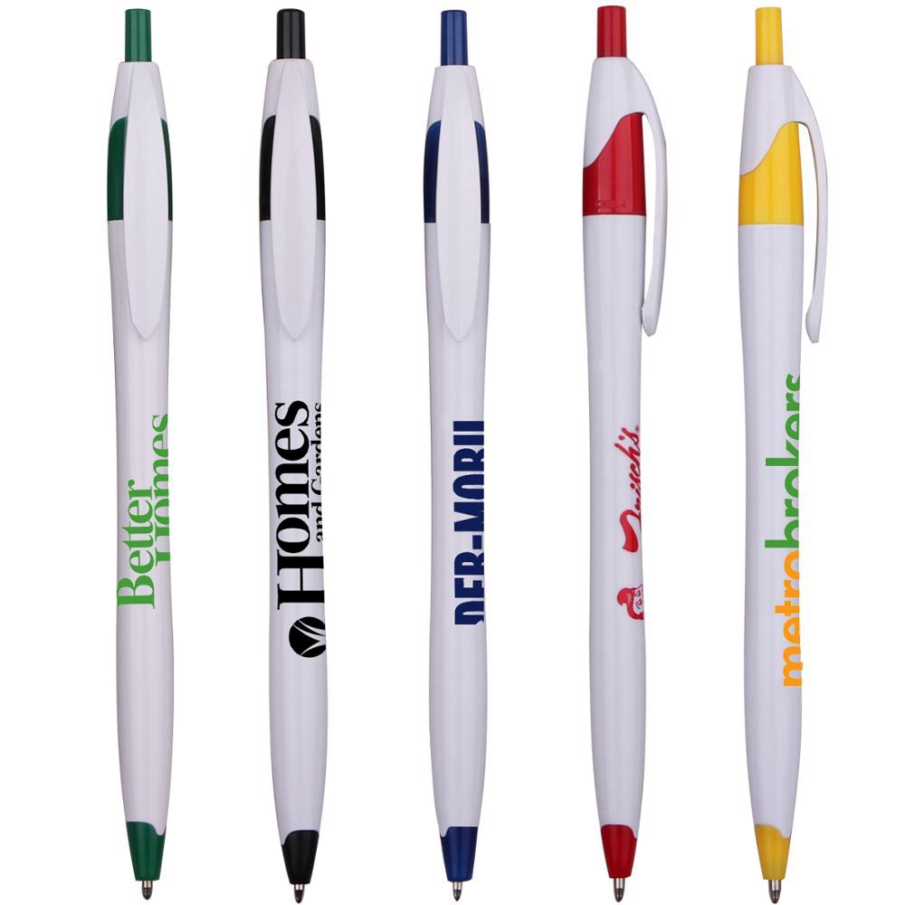 This click pen is one of our most popular promotional item ! The slim contour design,white barrel with your choice of black, blue, green, or red accents. Release the ball point with a click of the plunger action button,along with black ink tip. The graceful appearance with your logo can widely spread your brand through your clients' hands directly. Great for any occasion! Sometimes simple can do more ,This budget pen is one!