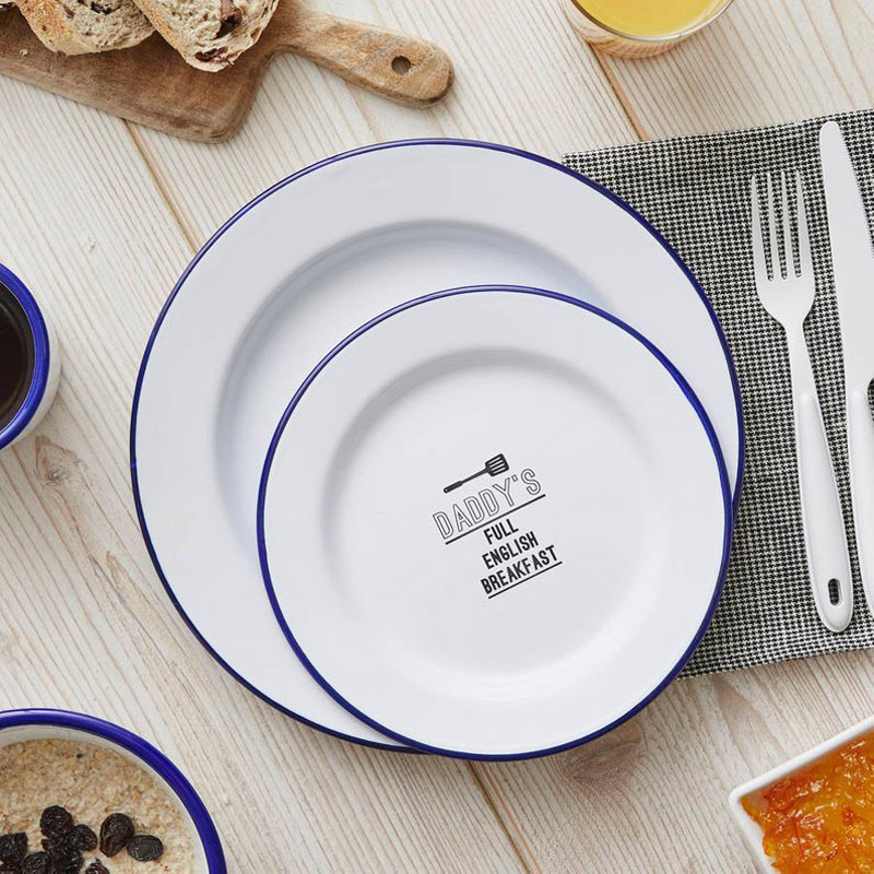 Made from high quality carbon steel and coated w/porcelain enamel in a two coat process that results in a glossy yet slightly textured surface. Lightweight, Shatterproof, & Easy to Clean.This dinner plate is protected by a stainless steel rim that enhances its appearance.