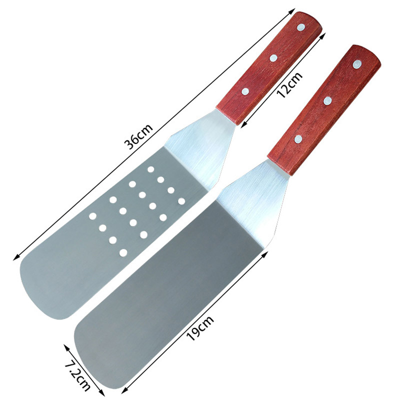 This metal spatula is made from high quality, food grade stainless steel that's wear and corrosion resistant. There are 2 styles available: Both have a polished, stainless steel surface while one has a flat, smooth flipping end and the other is flat w/integrated holes. The handle is made from solid wood and easy to grip firmly. Suitable for oven, microwave, stove top, or grill. You logo can be laser engraved.