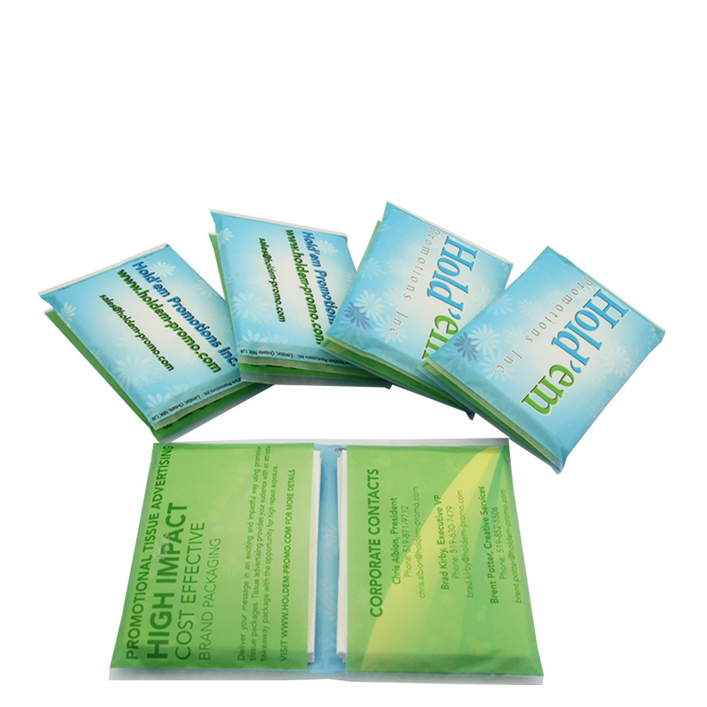Custom full color printed tissue packet. Size: 3.2"x5". There are 8 tissues in each packet. Portable and convenient. Your customized artwork can be imprinted on the whole outside of packet. Great promotional item for any large event, sports meeting, concert, exhibition or other activities.