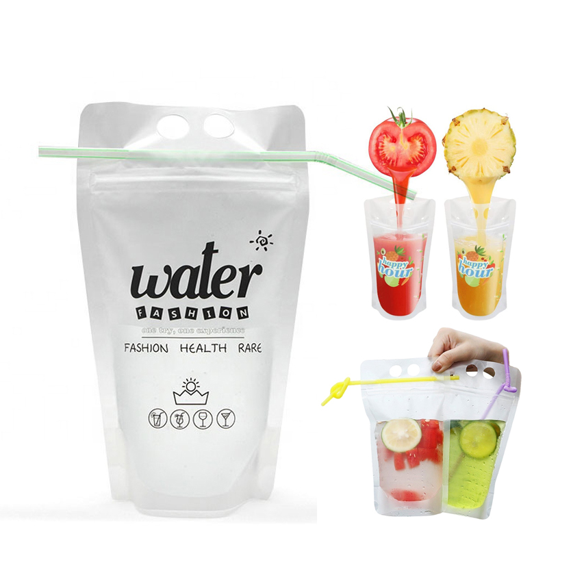 Our drink bag is made from food grade material which made of non-toxic, two big holes and two small holes design. Small holes can better set up straw when not use, big holes are convenient to carry. The reclosable zip ensures easy opening and no leaking accidents, come with straw. , convenient and reusable. Great for drinks, nuts, sugar containment, coffee, biscuits and so on. price based on volume is 500ML/16OZ. drink bags are more novel for caterer and party planner which will make something different for your party and family gathering.Welcome your logo printed on it .
