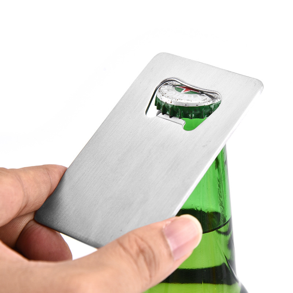 This credit card-shaped bottle opener is made of stainless steel. It is the perfect bar tool that fits right in your wallet!