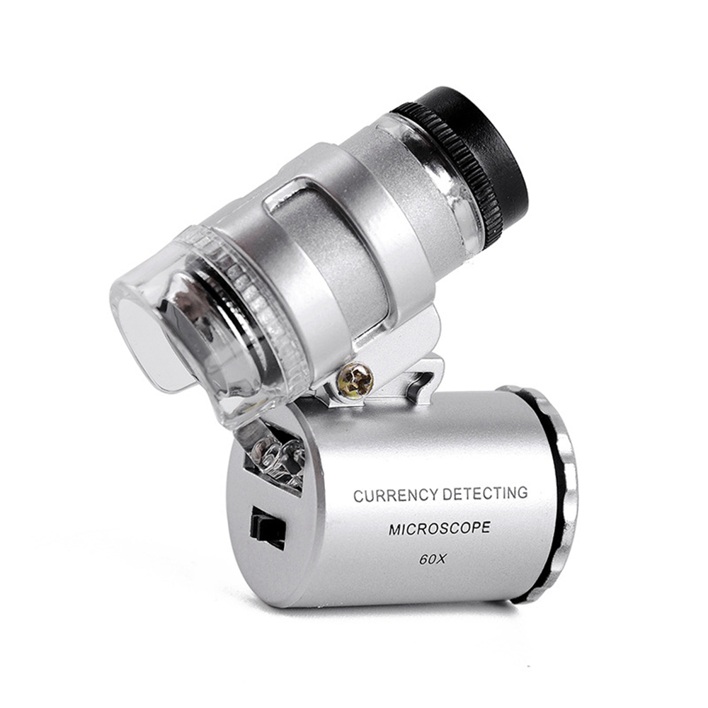 Mini microscope with LED light, or jewellery magnifier loupe. Pocket size 1.4"x1.57"x0.8", 60X times magnifying, can adjust the focus. Great for Gardening, Coin, Stamp, Jewelry, Appraisal, Education, Geography, Home And Office.Bright LED light of the Magnifying Glass provides enough light at any dim conditions. The pocket size is convenience to carry, you can use it in everywhere and every time.Batteries included.