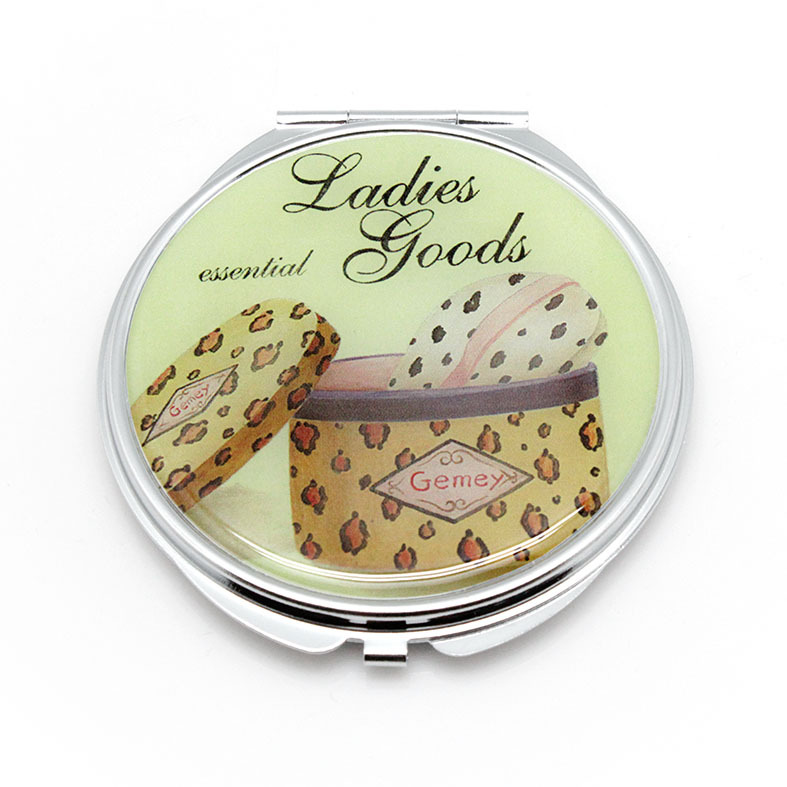 Custom high quality foldable cosmetic mirror. Round shape, double mirrors inside, easy opening. Pocket size: 2 3/8" X 2 3/8". Non-slip bottom design. Chrome plated metal surface. All material safety tested. Your artwork can be epoxy imprinted on the upside of lid. Hot sale on US market !