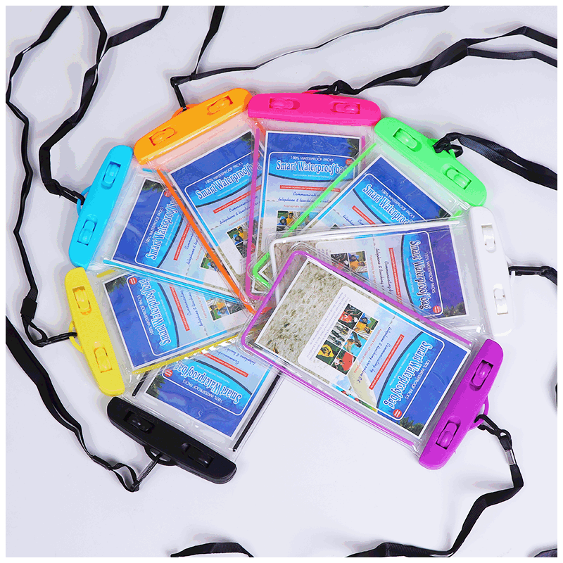 This mobile phone waterproof bag is made of PVC. Lightweight PVC casing with dual swivel lock and sealable closure clips safeguard your device against water, snow, dust and dirt. It is perfect for taking pictures and access touch screens without removing the waterproof bag. This water-proof bag can contain the phone whose screen is < 6 inch. Logo can be imprint to promote your business.