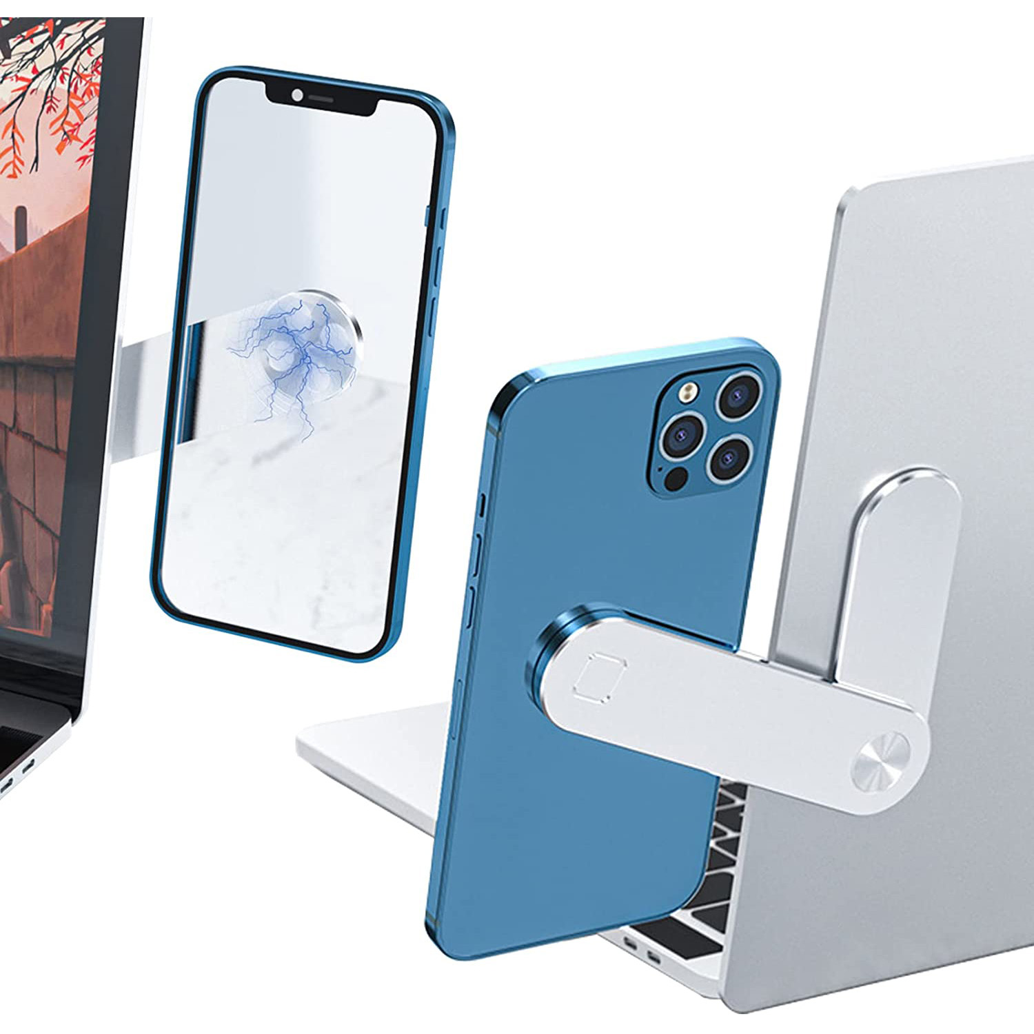 The phone bracket for laptop monitor allows to use phone and computer comfortably at the same time. Pendulum design, made from metal, fitting for all kind of flat computer display. Perfect for study, work, movies, games, improving your multitask efficiency without missing any call or messages on phone.Easy to pick and place the phone that fixed by magnet rather than snap. You can adjust certain angle for easy view, reducing fatigue of your neck. Conveniently folded and hidden behind the laptop for travel when standby. The metal piece that glued on phone helps it to attach to the magnet on the bracket quickly, can firmly hold the majority of phones even wearing the phone case. The bracket is stuck to the laptop by a piece of adhesive strip tightly.