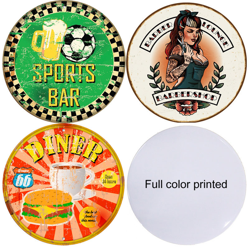 Retro vintage tin signs add nostalgic fun to home, garage, man cave, mechanics, auto services, bar, lounge, patio, cabin, basement, den, game/entertainment room, office or virtually any space.High quality print that will stand the test of time. Each piece measures 12 x 12inches / 30 x 30cm. Made of high-quality tinplate. Pre-drilled holes that you can be nailed or taped to the wall, or hang up with hemp cord or metal wire. We have many different shape for your choosing. Wecome your full color logo art printd on it !