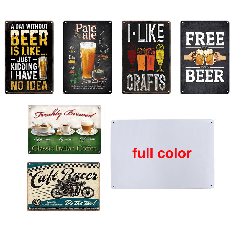 Made of high-quality tinplate,Each piece measures 7.9x11.8inch/20x30cm. the metal sign has conveniently placed pre-drilled holes for hassle-free mounting and installation. Suitable for decoration, pub, cafe, living room, bedroom, garage, garden, etc.We have many different shape for your choosing. Welcome your full color logo art printd on it !