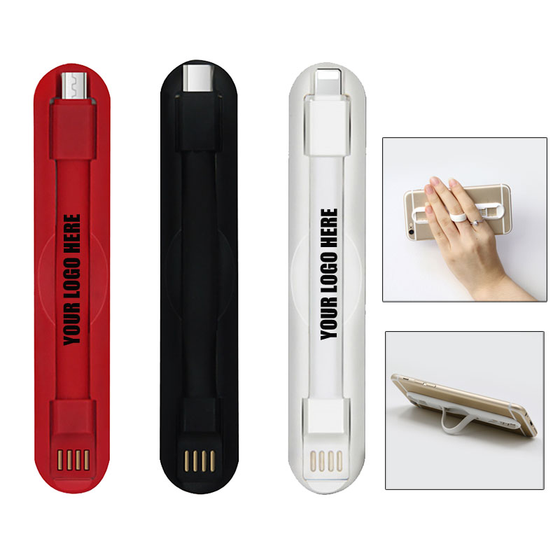 This promotional phone holder 2 in 1 charger cable can recharge all types of smart phones, micro/lightning/type c port for your choosing. Function with charging, data transfer and as mobile phone holder, it's made of abs+tpe. Perfect gift for your friends, family, colleagues, acquaintances or yourself, it has another function that can be used as a mobile phone holder, you can free your hands when we watch the video.