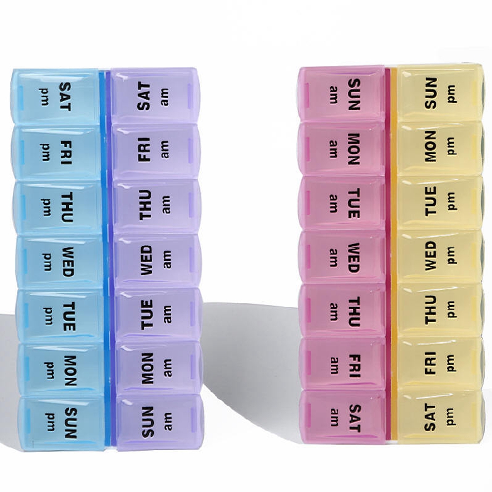 This pill box has 14 compartments to store medications or vitamins for an entire week. Each day has two compartments labeled am or pm for multiple dosing requirements.