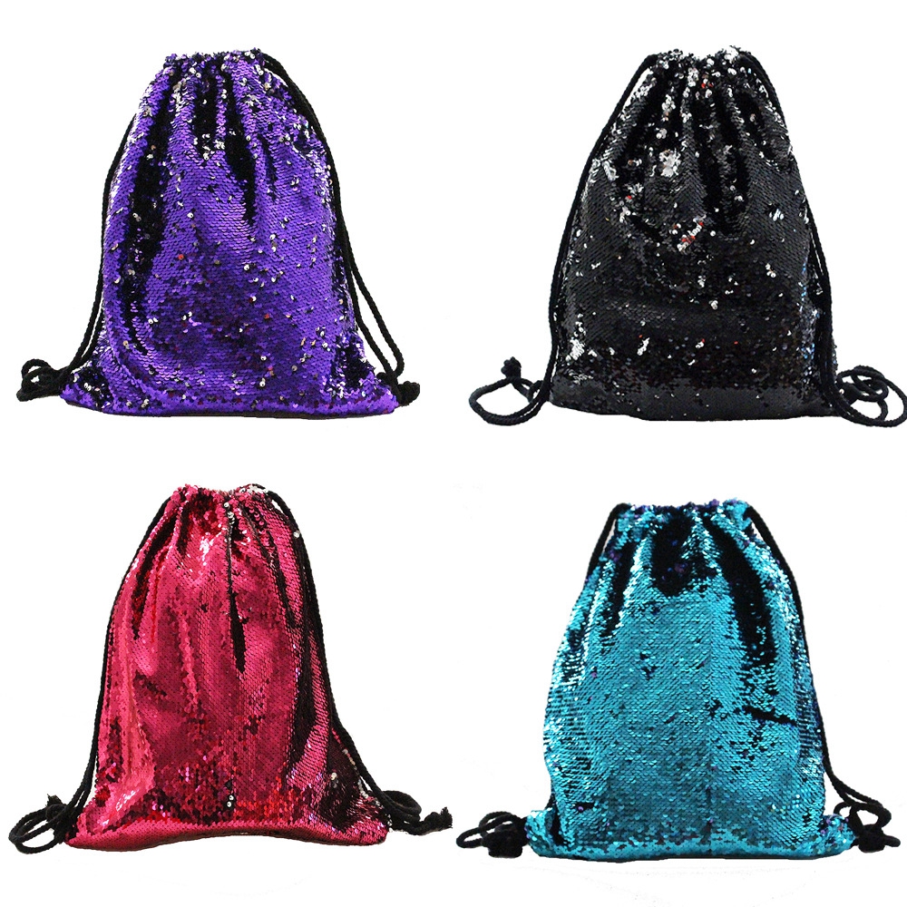 Sequin Drawstring Bag has many sparkling shells covered on surface. It will change color when you flip the sequins. Glitter and sparkling bag makes you look so shiny when you attend a party or wedding. Soft cloth is used on the back. It's great bag to use in any events.