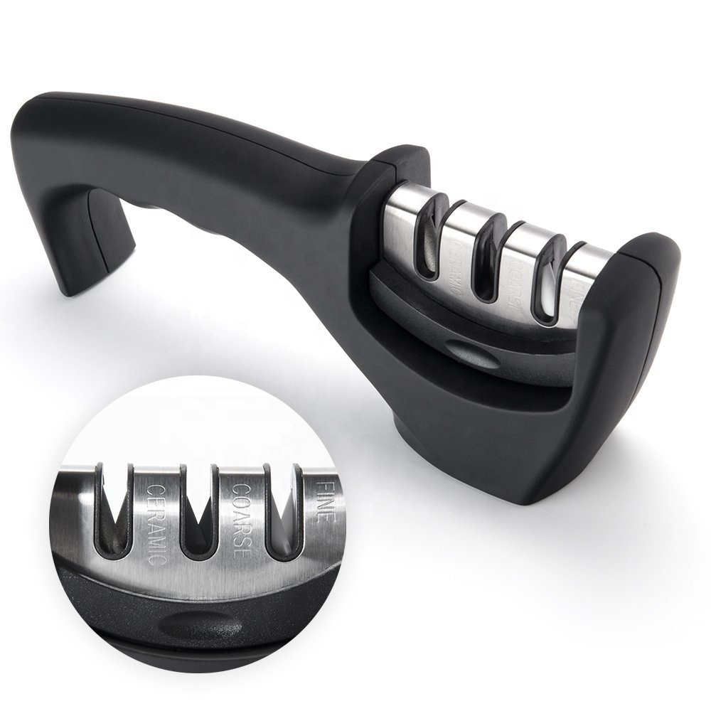 You will love this kitchen tool. Whether you¡¯re right or left-handed, the ergonomic handle allows you to restore your cooking knives in a matter of seconds! Simply place the blade in each of the slots and gently pull the knife through a few times for fast, effective sharpening. With our professional knife sharpener kit, you don¡¯t have to be a chef to cook like one! Crafted from solid ABS plastic, it¡¯s strong, durable and designed to last a lifetime. Made with high quality materials